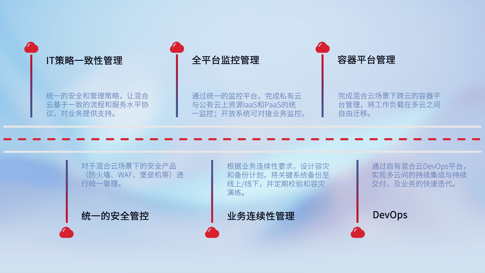 通过多云纳管,,,以统一的资源数据模型把客户的云资源进行抽象和封装,,,进而实现对多云资源的统一操作,,,保障云资源管理的可靠性、、、、稳定性与可用性。。。。量身定制化运维内容,,,,配置、、、、开发运维、、、、补丁管理、、、备份、、、、监控、、认证和访问管理、、、审计和日常巡检等,,保障在用云过程中的可靠度,,,稳定度以及高可用率。。