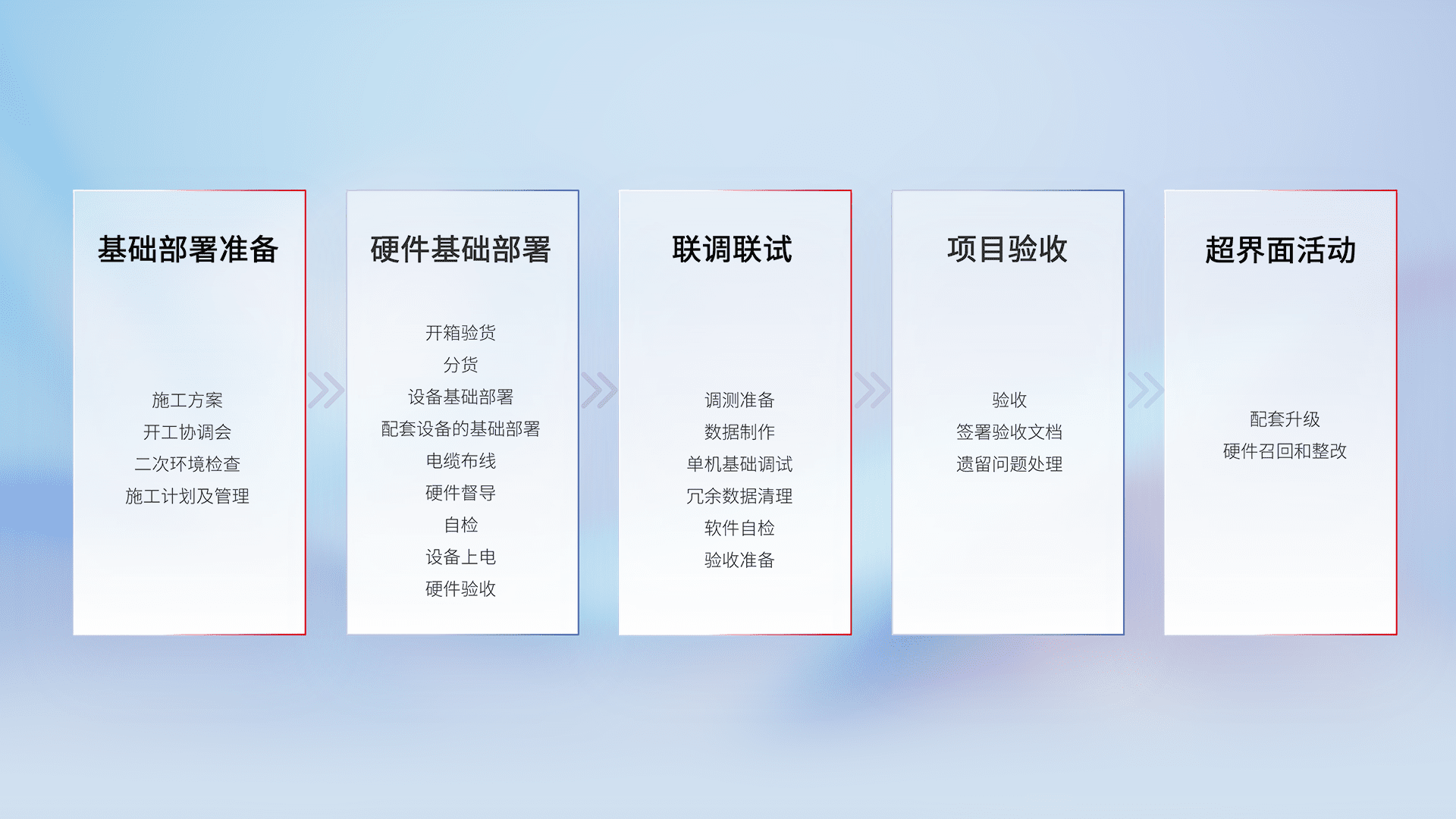 从基础部署准备、、、、硬件基础部署、、联调联试、、、项目验收、、越界面活动的全过程可追溯,,,保证施工质量和进度。。。。